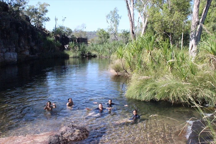 Yet we did swim everyday, in freshwater swimming holes high up on the cliffs and plateaus, some as big as an Olympic pool, some deep dark holes but all completely natural, without another soul in ‘cooeee’ (or sight) and all with a gushing waterfall, the perfect spot for cooling off after a hot climb to see spectacular and ancient Aboriginal rock art galleries.